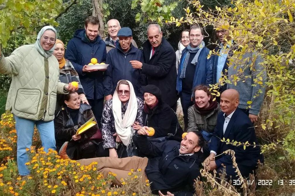Die Kooperationspartner aus Kasserine und München sind in einem Garten versammelt. Sie halten Orangen in den Händen.