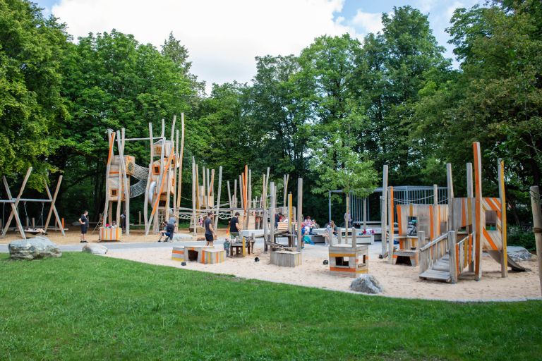 Der vom Baureferat (Gartenbau) komplett neu gestaltete Spielbereich umfasst inklusive Elemente wie ein mit Rollstuhl befahrbares Karussell, eine barrierefrei anfahrbare Nestschaukel und rollstuhlgerechte Trampoline. Die Haupt-Attraktion des Spielplatzes ist vor allem der neue, mehrere Meter hohe Wasserspielbereich, der zum interaktiven Spielen und Experimentieren anregt. Eine neue Kletter- und Spiellandschaft samt Aussichtsturm mit Röhrenrutsche und sechs Podeste mit verschiedenen Aufstiegen und Brückenelementen laden zum Klettern und Balancieren ein.