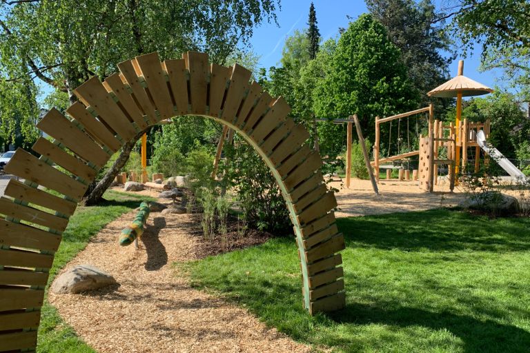 Auf einer Fläche von rund 1.000 Quadratmetern sind neben einem inklusiven Karussell auch ein rollstuhlbefahrbares Trampolin, eine Nestschaukel und ein vielseitiges Klettergerät aus Holz hinzugekommen. Der bestehende Spielplatz stand während der Bauzeit uneingeschränkt zur Verfügung.