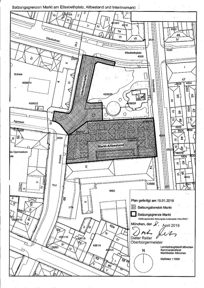 Plan Satzungsgrenzen Markt am Elisabethplatz, Altbestand und Interimsmarkt, Maßstab