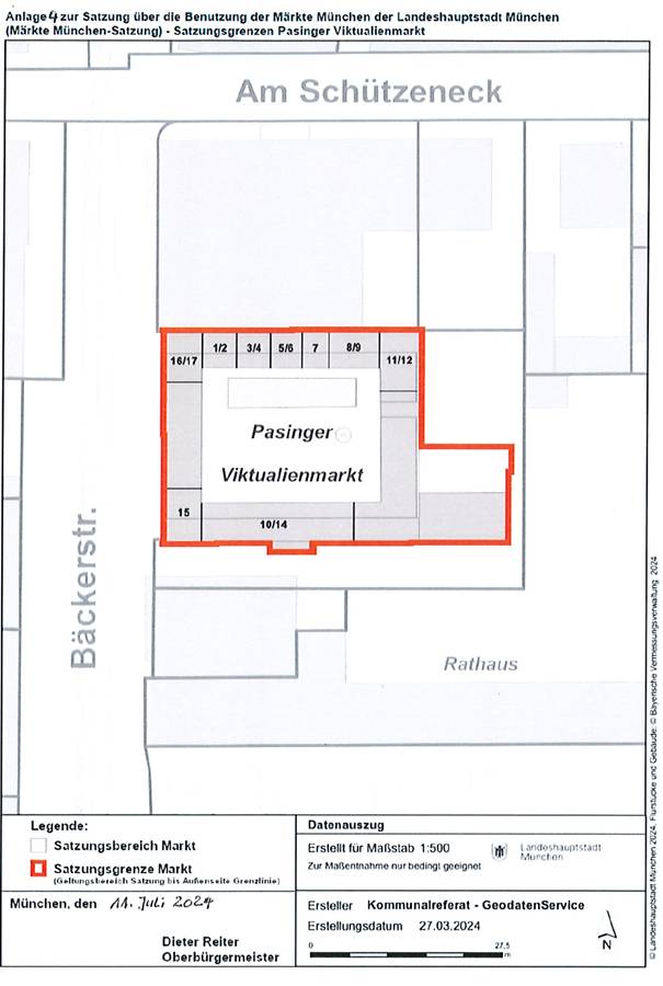 c) Plan für den Pasinger Viktualienmarkt, Stand: 27.03.2024, Maßstab 1:500, ausgefertigt am 11.07.2024 (Anlage 4),