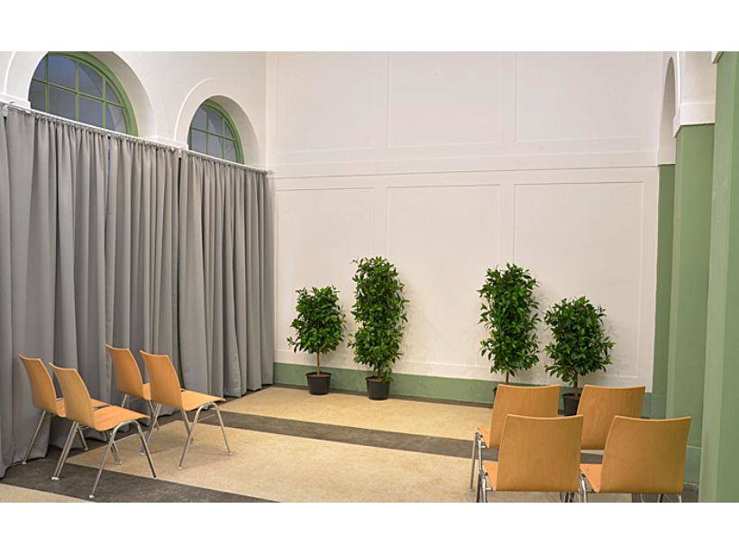 Der Verabschiedungsraum fügt sich in die historische Architektur der Gebäude aus dem Jahr 1907 ein. Die Gestaltung ist schlicht und beschränkt sich auf das Wesentliche. Der Verabschiedungsraum kann sowohl für eine reine Verabschiedung als auch für eine Trauerfeier in kleinerem Rahmen genutzt werden.